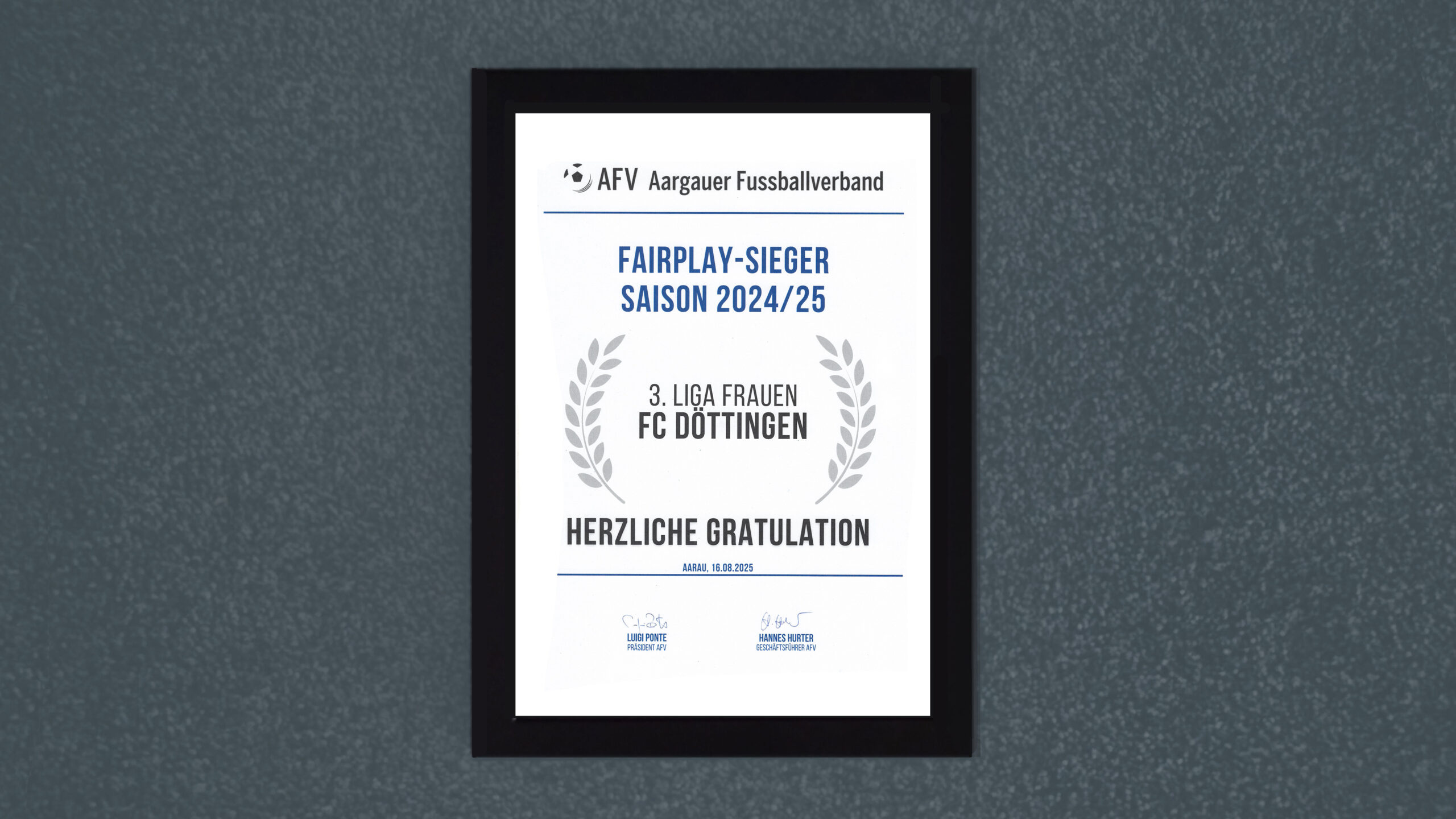 Anlässlich der Delegiertenversammlung des Aargauischen Fussballverbandes in Würenlos wurden unter anderem die Fairnesssieger der abgelaufenen Saison gewürdigt und mit einem Diplom und einem finanziellen Zustupf belohnt. Die Döttinger Fussballfrauen siegten in ihrer Kategorie überlegen vor den Frauen des SC Seengen. Das Team liess sich administrativ nichts zu schulden kommen und holte in der ganzen letzten Saison nur eine gelbe Karte!!! Kompliment an das Team um Corinne Stäuble für diese vorbildliche Leistung! Der Verein betont immer wieder, wie wichtig Fairplay ist und das es belohnt wird. Auch der Fussballverband gibt dem Fairplay einen sehr hohen Stellenwert. So ist beispielsweise der Fairplaysieg der am höchsten dotierte Preis in jeder Liga. Döttingens Fussballfrauen holten sich diese Auszeichnung bereits in den Jahren 2016/2017/2018, damals 3 Jahre in Serie und waren auch in den anderen Jahren fast immer vorne dabei. Der ganze FC Döttingen freut sich sehr über diese Ehre und gratuliert den Team.