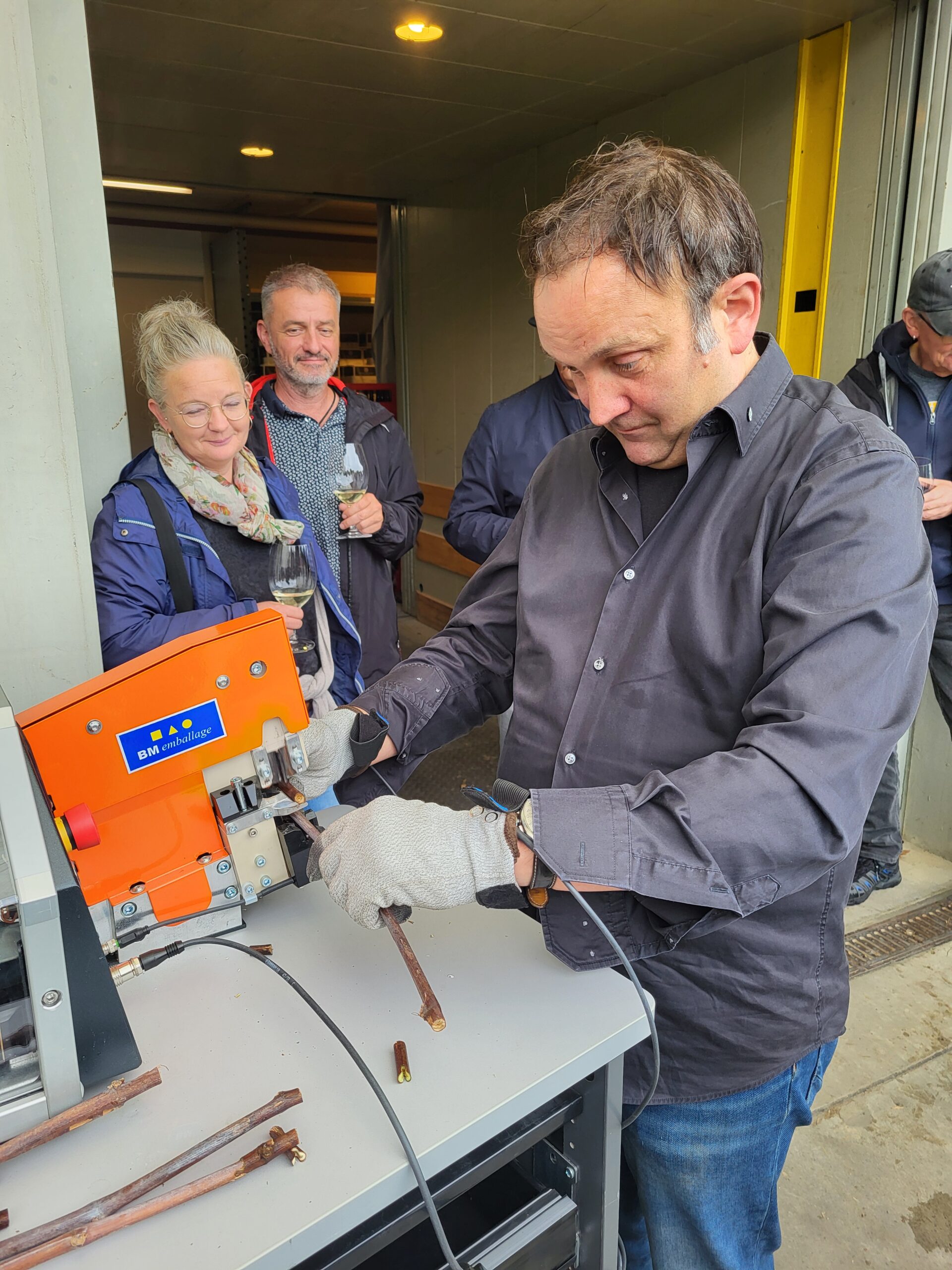 Manuel erklärte der Gruppe den Omega-Schnitt, eine spezielle Schnitttechnik, die bei der Rebveredelung angewendet wird. Die Methode ist benannt nach der charakteristischen Form des griechischen Buchstabens Omega (Ω), die entsteht, wenn der Schnitt am Unterlagsrebenholz und am Edelreis ausgeführt wird. Der Omegaschnitt im Weinbau ist ein Beispiel für die Verbindung von traditionellem Handwerk und moderner Technik. Es ist eine Methode, die Fachwissen und Präzision erfordert und entscheidend zur Qualität und Langlebigkeit der Weinreben beiträgt. Trotz der technologischen Unterstützung bleibt die Veredelung eine Kunst, die das tiefgreifende Verständnis des Weinbauers für seine Reben widerspiegelt.